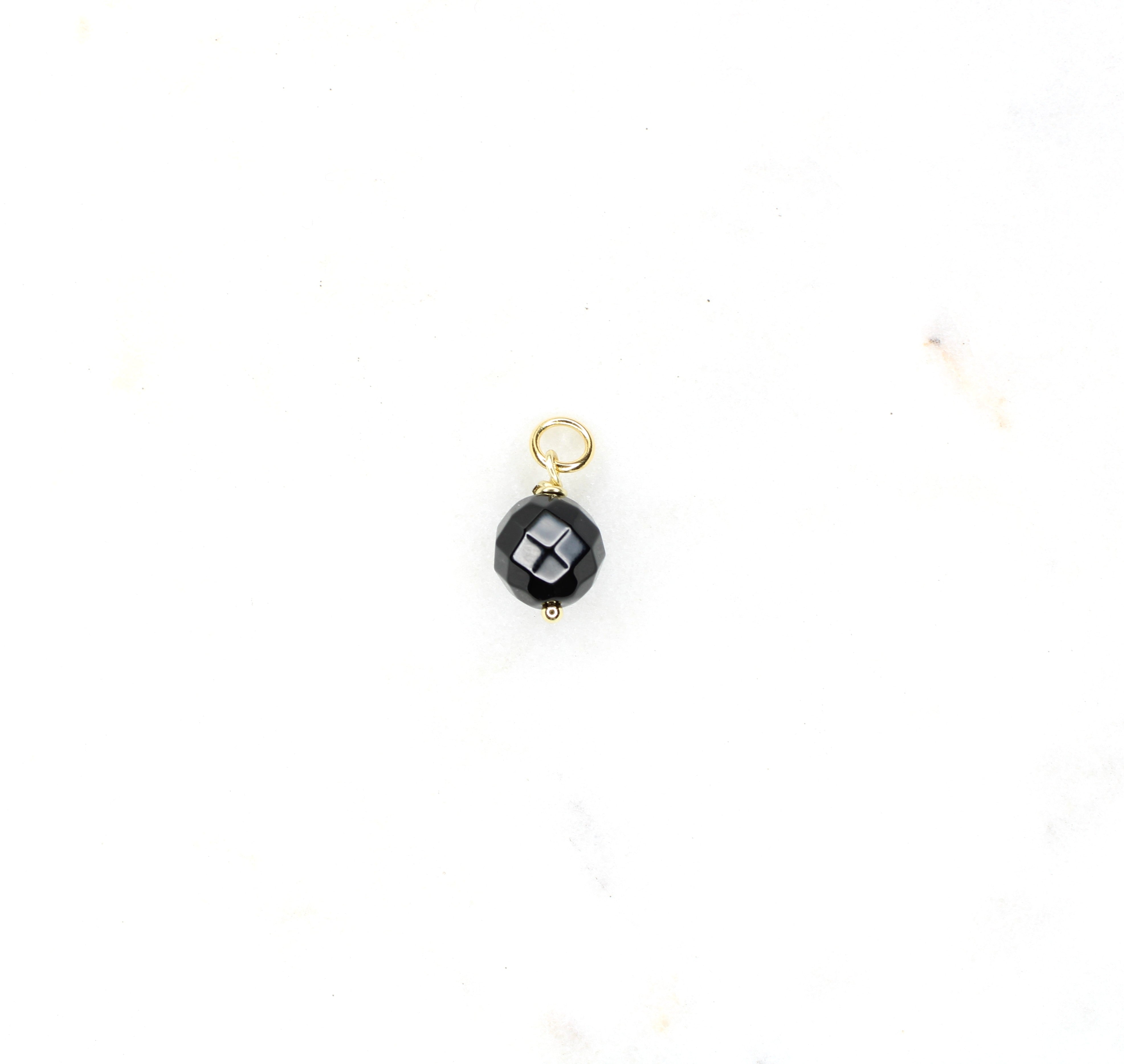 This timeless charm features a polished black onyx stone in a classic faceted round design. Whether worn on a bracelet, hoop earrings or necklace, or keychain, this charm is sure to infuse your day with positivity and joy. This unique combination creates a sense of balance and tranquility, perfect for adding a touch of serene beauty to your jewelry.