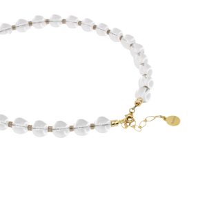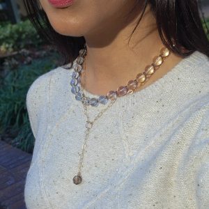 This one-of-a-kind piece, we know you’ll love this confidently chic clear crystal beaded collar necklace, with a rare natural ice obsidian spacers and gold-plated stainless steel carabiner style closure. Perfect to add a charm or large pendant to create unique and personalize touch.