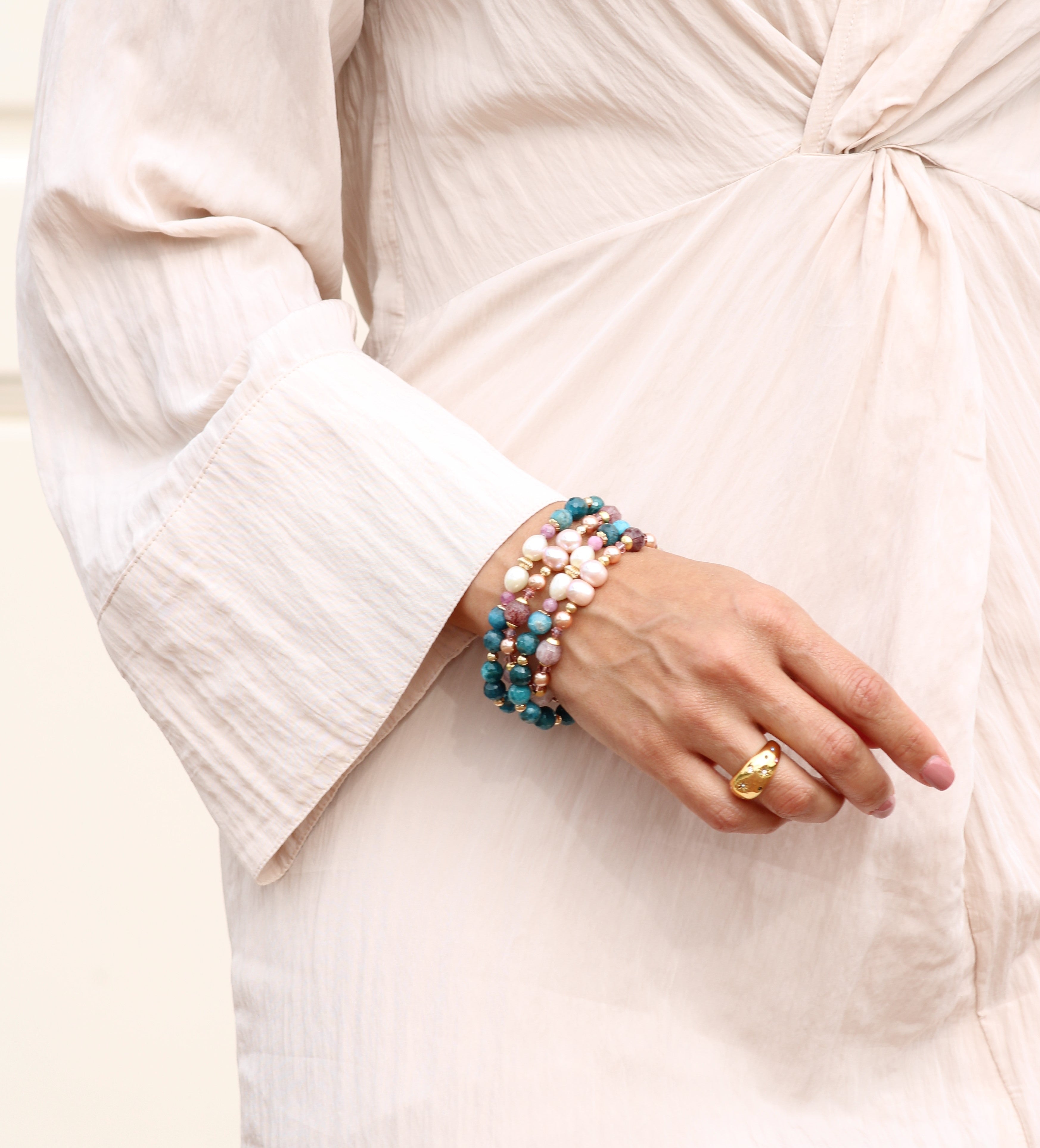 - Designed with high quality elastic cord and 14k Gold filled accents.