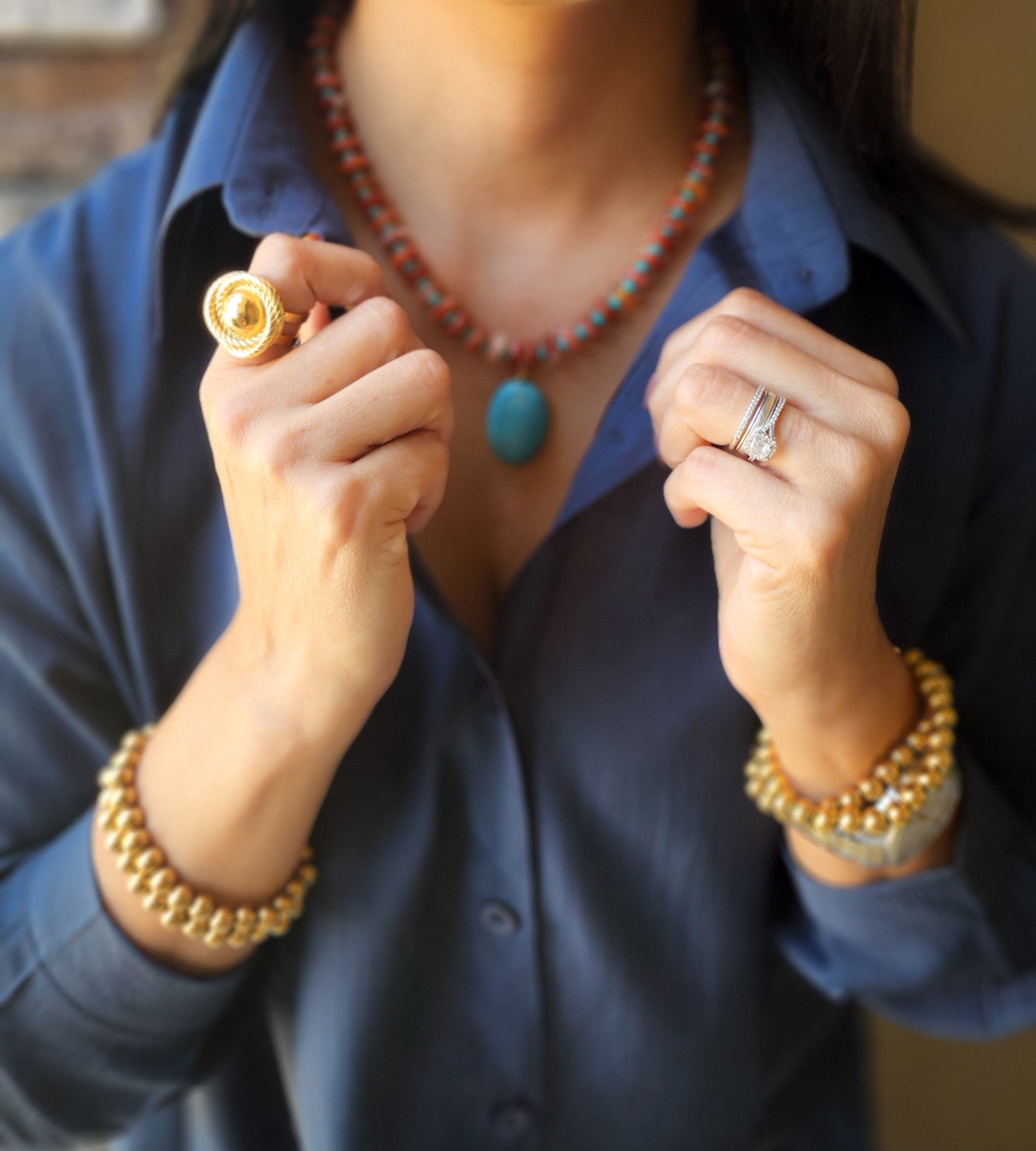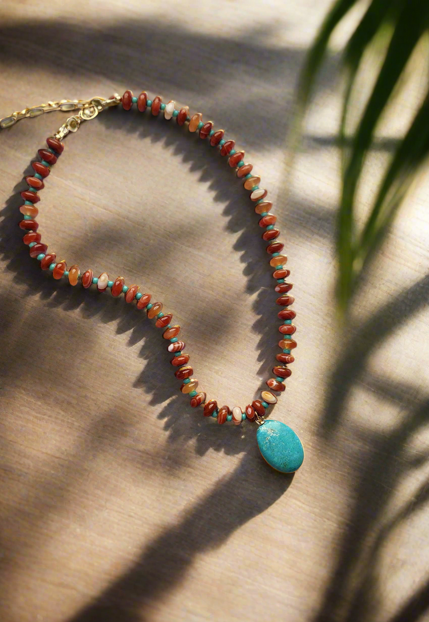 This one-of-a-kind necklace blends natural textures and vibrant tones, designed to inspire both grounding and serenity. The combination of earthy agate, soothing turquoise, and hand-strung beads creates a piece that’s both bold and versatile. Perfect for layering or as a statement necklace on its own, it carries a touch of natural beauty wherever you go.