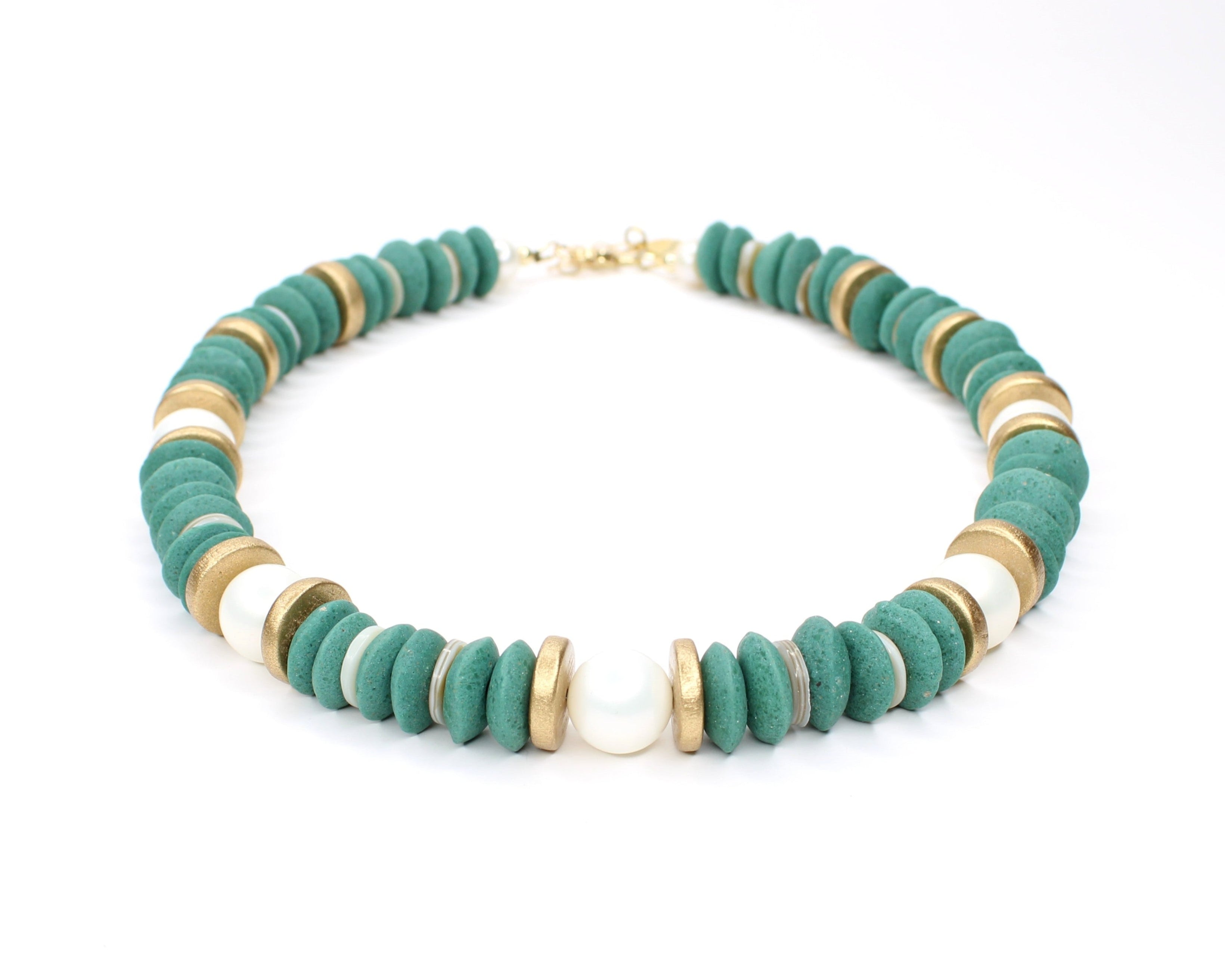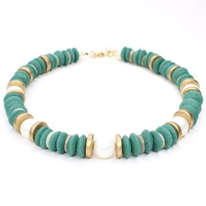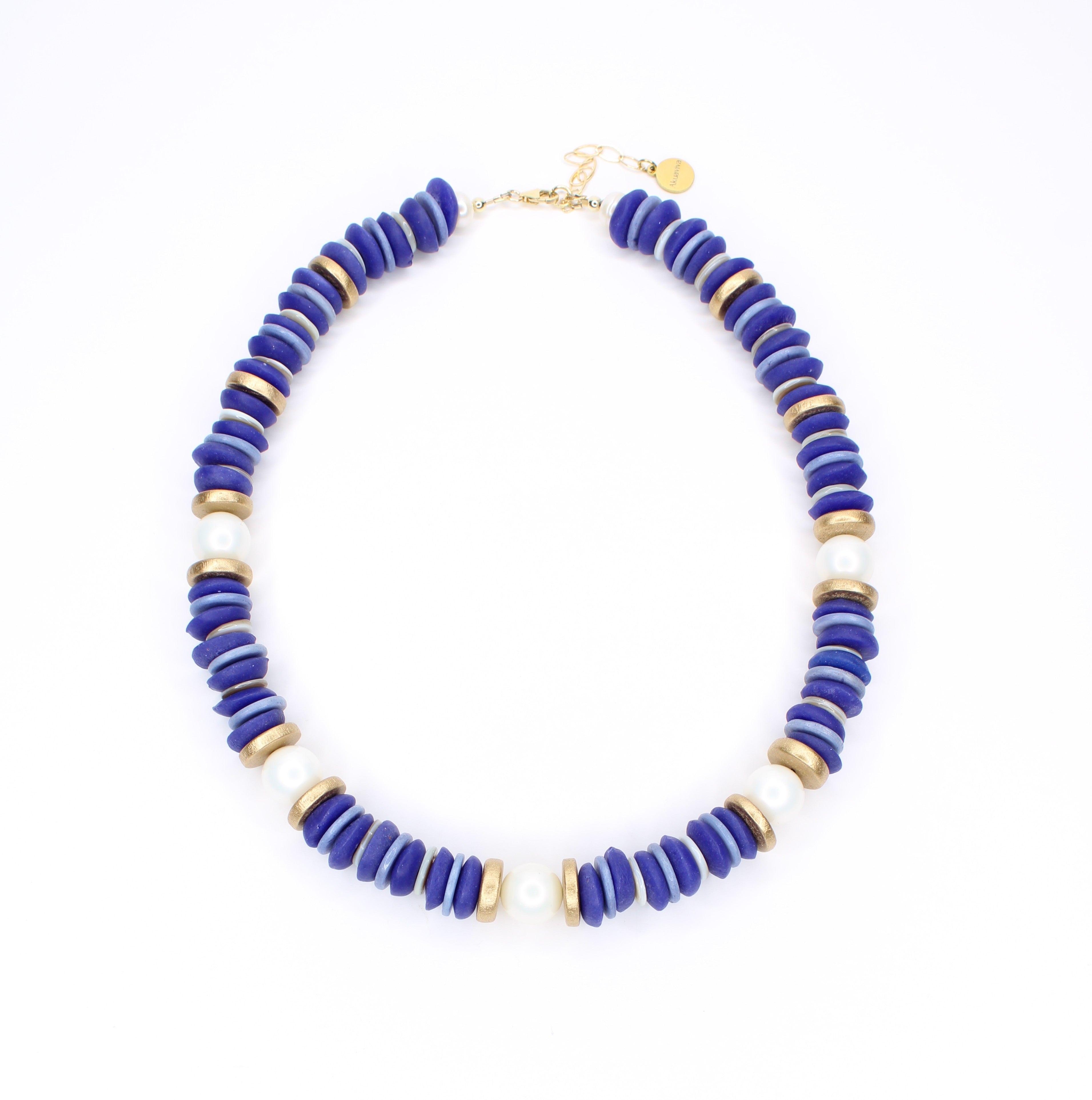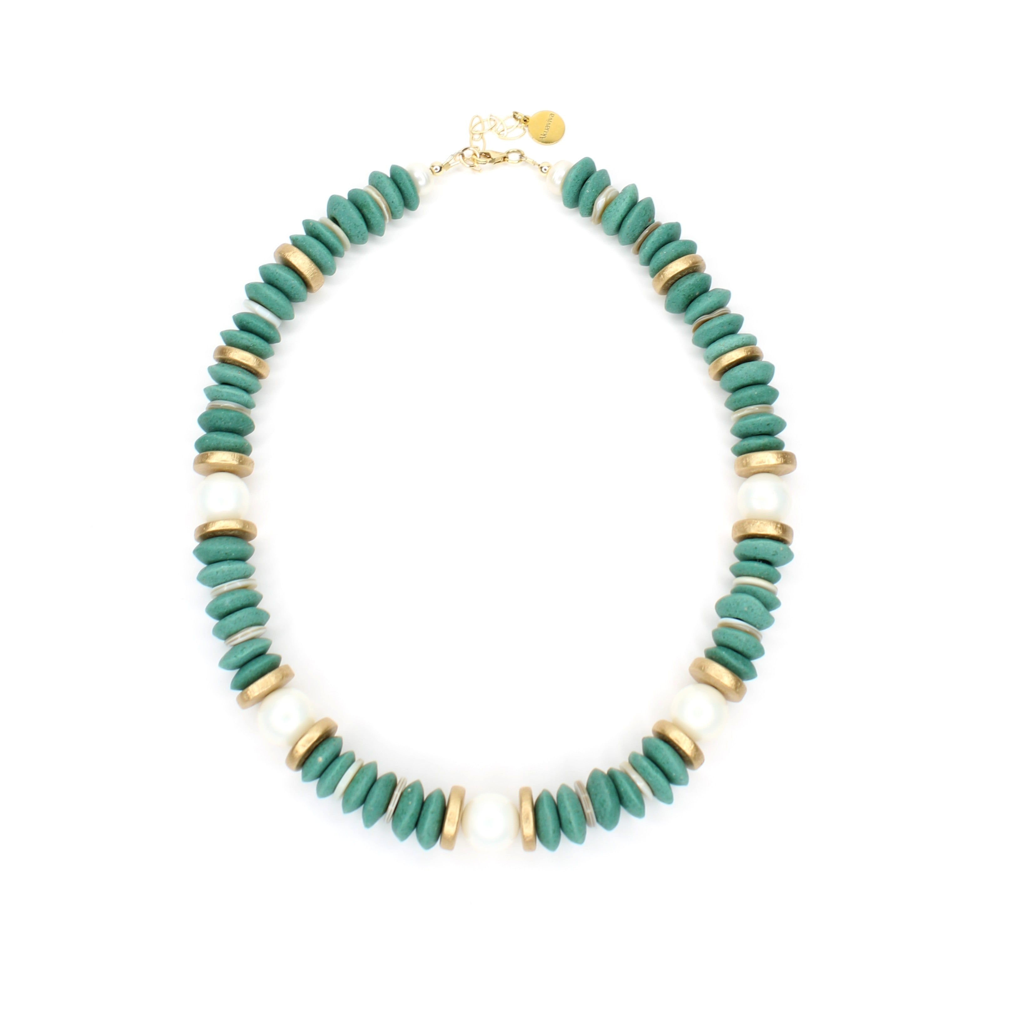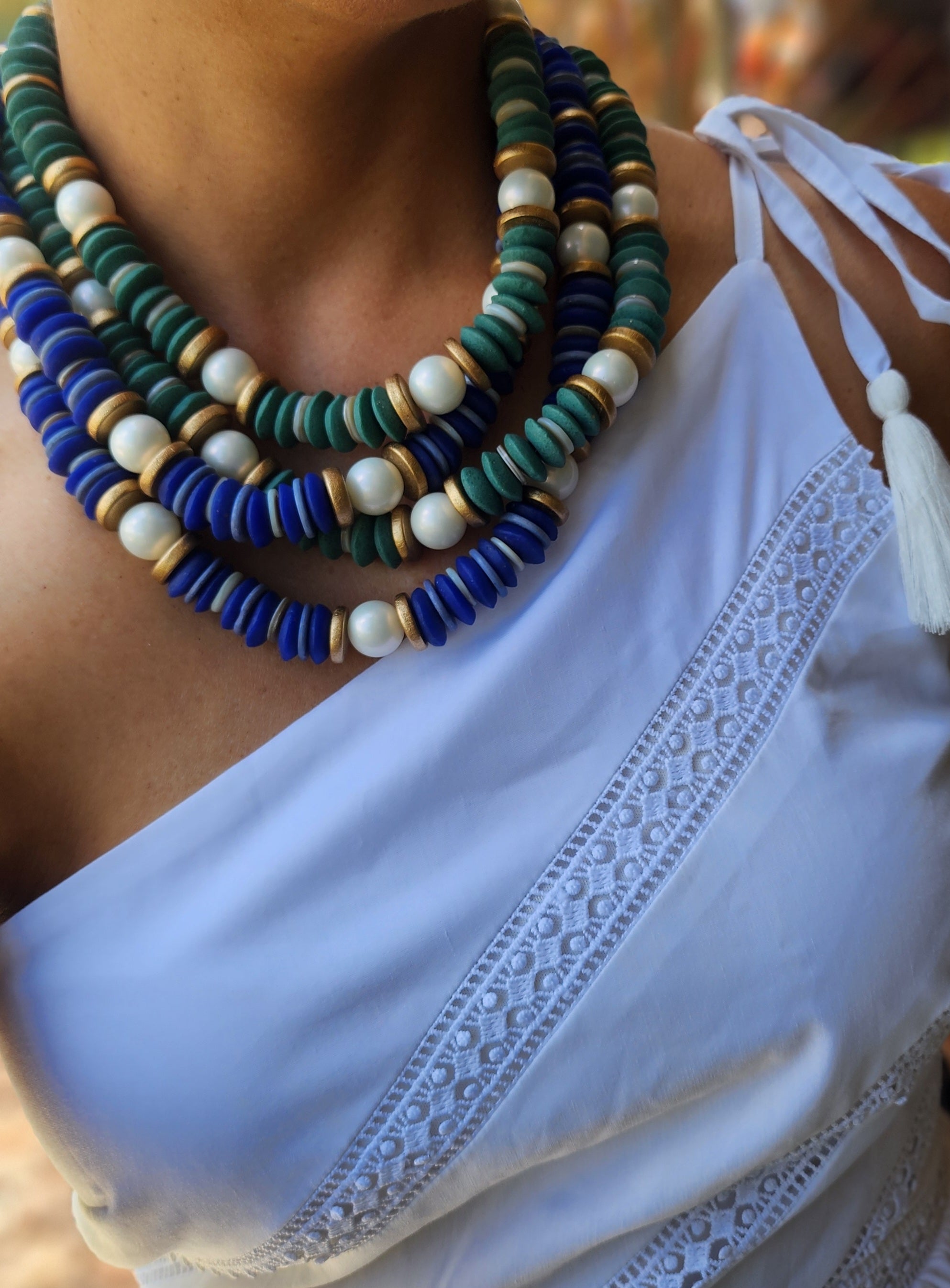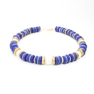 Inspired by coastal serenity and handcrafted traditions, Island Grace features Java recycled glass beads, luminous mother of pearl accents, and hand-painted golden wood touches. Wear it solo for a subtle statement or layer it to amplify its storytelling beauty. Each bead speaks of renewal and resilience an invitation to adorn yourself with meaning.