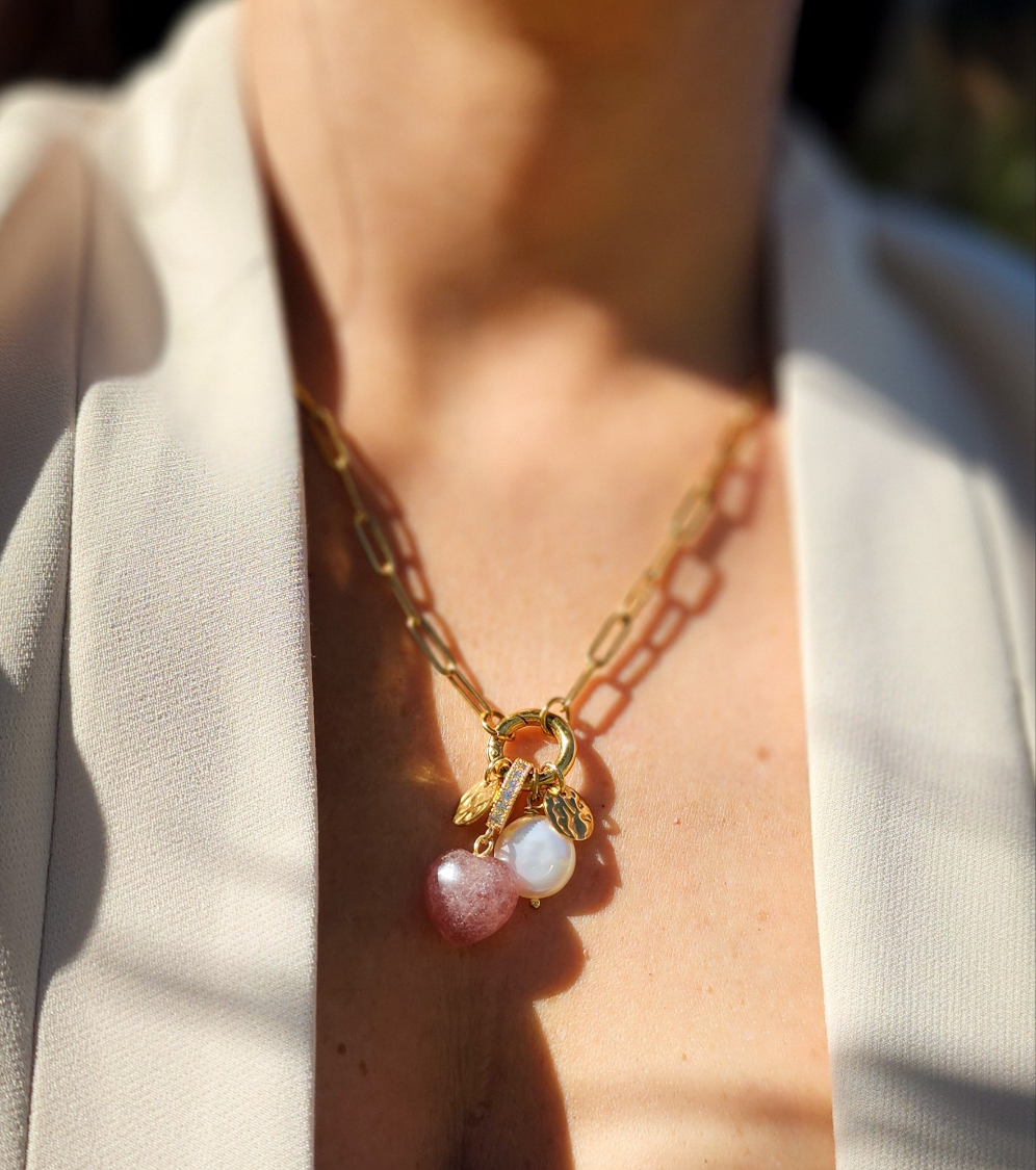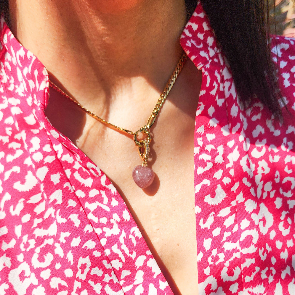 Embrace the gentle energy of love with our Strawberry Quartz Heart Charm. This delicate heart, crafted from genuine strawberry quartz, radiates warmth and joy. Wear it as a reminder of self-love and the beauty of connection. Add a touch of rosy elegance to your jewelry collection.